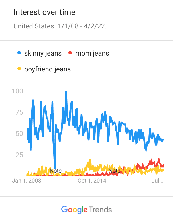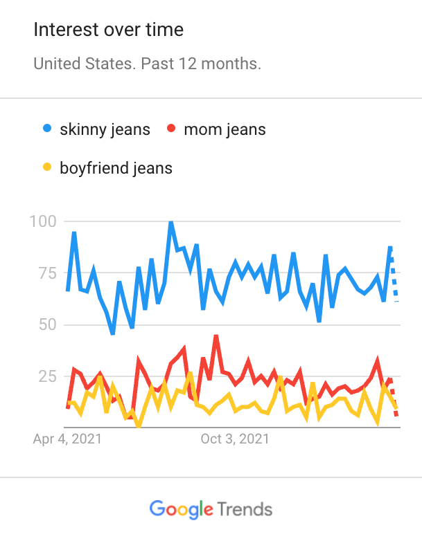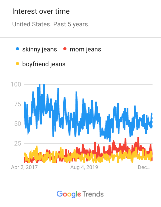 In the past 5 years, interest in skinny jeans has decreased slightly, with interest in mom and boyfriend jeans increasing a bit. However, Google Shopping trends show that skinny jeans continue to dominate.